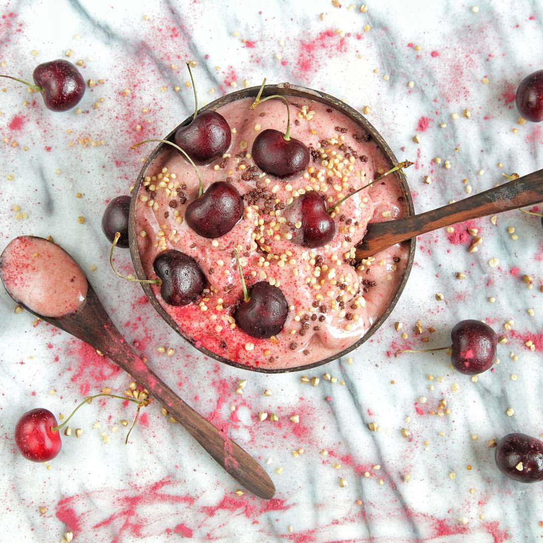 Blend ingredients in a food processor or high-speed blender until creamy. Top with additional cherries, chocolate covered chia seeds, quinoa crispies, and beet root powder, if desired.View original recipe
