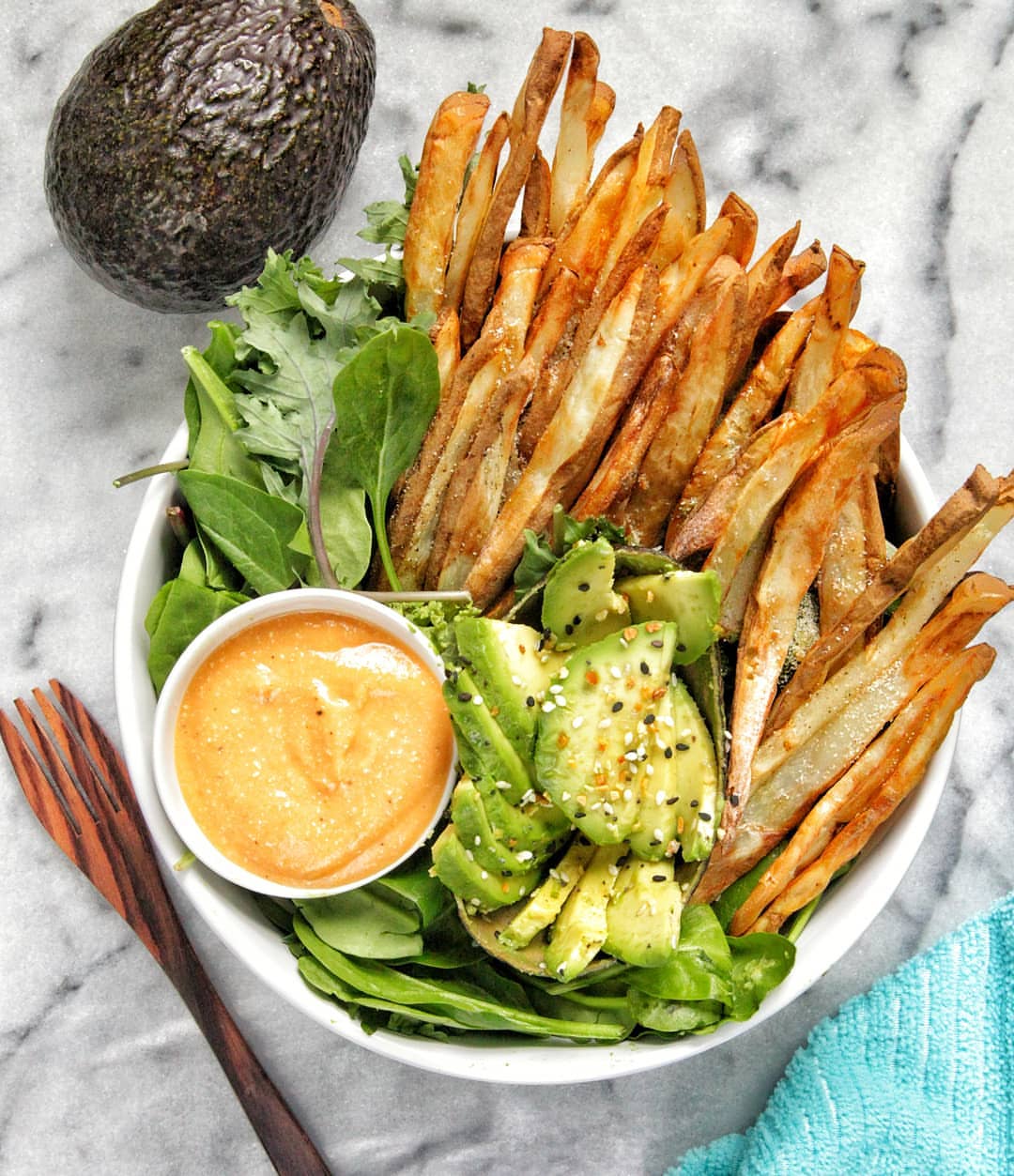 Slice potatoes into fries. Soak the sliced potatoes in water for 15-20 minutes and then remove them from the liquid. Season the fries with black pepper, garlic powder, onion powder, and some turmeric. Bake for 35-40 minutes in a 450 degree oven. Tip: Soaking potatoes in water removes excess starch and allows for crispier fries.View original recipe