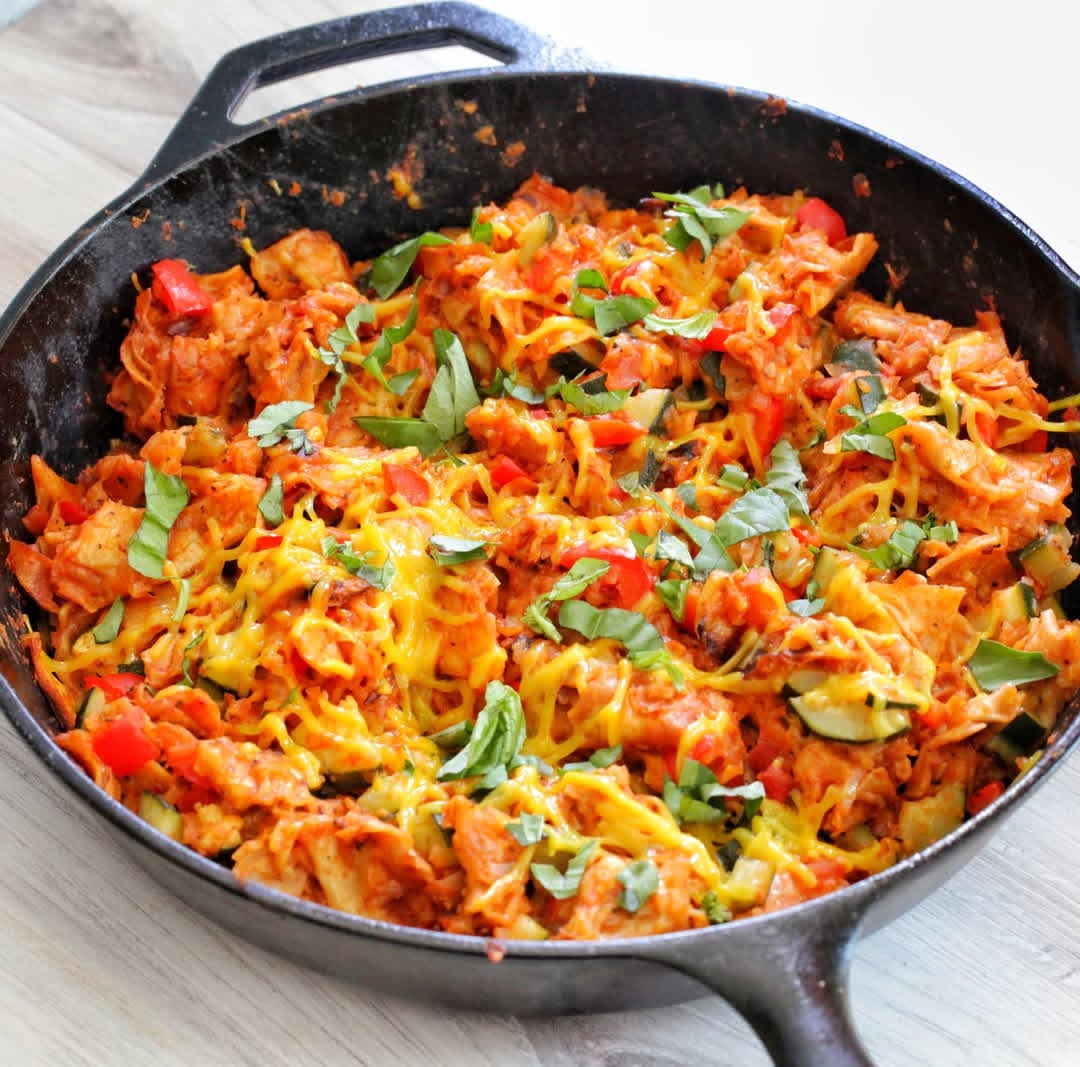 Skillet enchilada casserole is a delicious, vegan, and rich dish made with tortillas, vegetables, tomato sauce and vegan cheese. It is jam-packed with flavor and you can add more vegetables to make it a healthy hearty dish