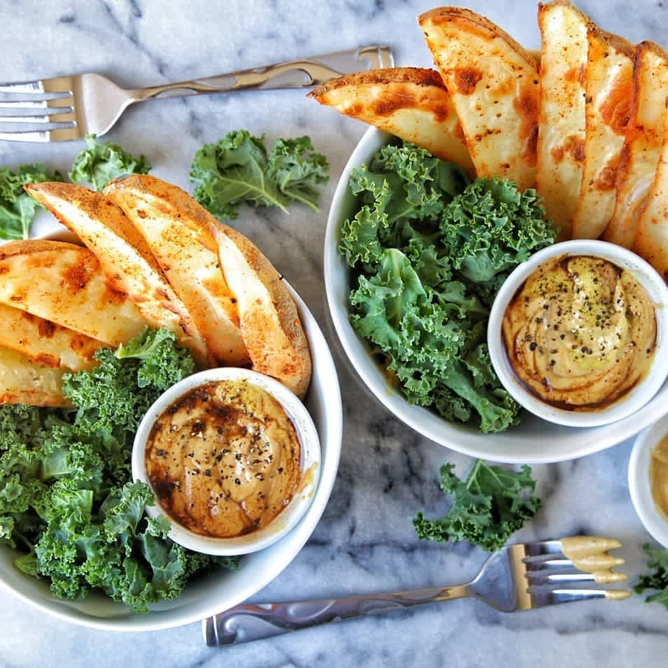 Spicy Potato Wedges with Kale and Spicy Mustard Balsamic Vinegar Sauce