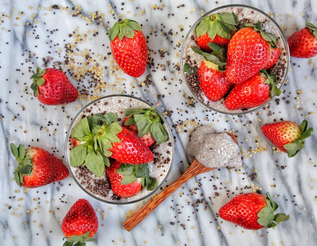 Besides smoothies, chia pudding is one of the quickest breakfasts to put together in the morning. This recipe for white chia pudding is topped with strawberries, quinoa crispies, and dark chocolate covered chia seeds.